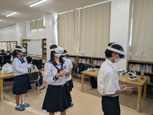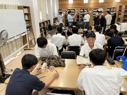 生徒たちは「メタバース・VR」「視覚の錯覚(錯視)」「身体の錯覚」の3つのテーマを体験し、メタバース体験でAI制御の恐竜と会話したり、錯覚体験で体の不思議を体感したりしました。どの生徒も意欲的にメタバースと身体拡張について学びました。