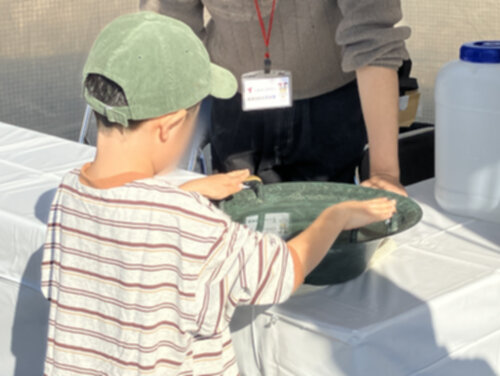 豊田将也准教授と研究室学生3名が、『水の共振で噴水を起こそう!』『防災に関する最新の研究を知ろう!』というテーマでブースを構え、水を張った鍋の持ち手を両手でこすって上手に振動が伝わると水しぶきが上がる現象に、子どもだけでなく大人も挑戦し、300人近い方に体験していただきました。
