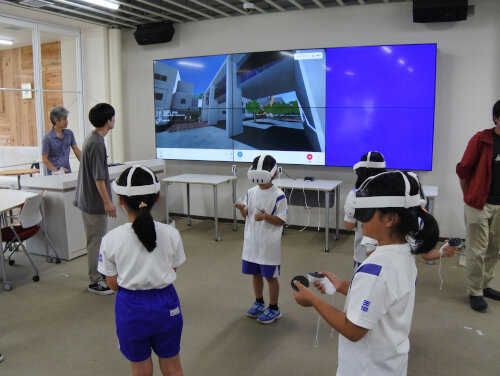 まずはじめに、天伯小学校と豊橋技術科学大学の各種データを比べ、広さ、教職員の数、学生・児童の数等がどれくらい違うか説明を受けた後、4グループに分かれて、図書館探検、VRゴーグルを装着したメタバース体験、スライムハンド錯覚体験、実験実習工場探検をしました。